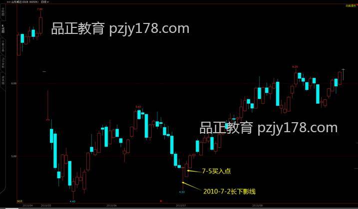 如图3-7所示,2010年6月中句开始,山东成达(0020票小幅回调。7月2日,股价大幅下后被强势拉升,戒至驶盘出现一根带长下影线的K线。这个形态表诉股价下获得强力支撑,下跌行情即将结束
