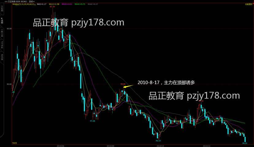 如果个股早盘虽然冲高,但是盘中走势不仅走弱、而且跌破均价线并回抽无力,此时投资者要保持警,因为有可能该股在开盘的冲高,仅仅是主力的一个诱多动作。如图2所示,2010年8月17日,汉王科技(002362)在早盘时段放量冲高。但是开盘半小时后,股价开始逐渐走低,并且在下年开盘半小时内跌破均价线。这个形态说明开盘后股价冲高可能只是主力在诱多。开盘追高买入的投资者应该在随后一个交易日将股票卖出。
